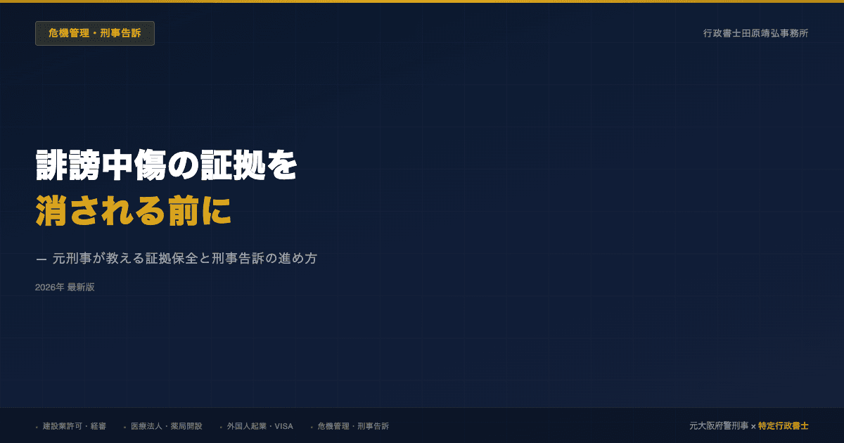 ネット上の誹謗中傷で最も怖いのは証拠が消えること。投稿の削除、アカウントの消去、プロバイダログの期限切れ——「あとで告訴しよう」では手遅れになります。名誉毀損罪・侮辱罪・信用毀損罪の整理から、元大阪府警捜査二課刑事が実践してきた証拠保全の5つの鉄則、捜査官が「動ける」告訴状の作り方まで、実務経験に基づいて解説します。