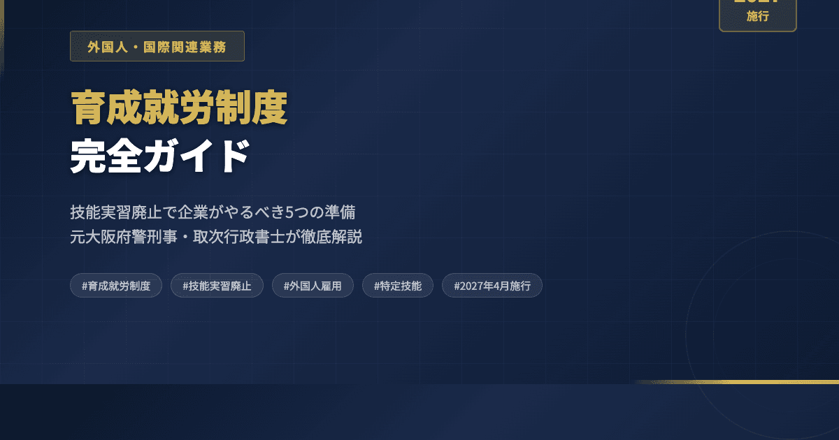 2027年4月、技能実習制度が廃止され育成就労制度がスタート。転籍(転職)の容認、日本語能力要件の新設、不法就労助長罪の厳罰化など7つの主要変更点と、2026年中に企業が取り組むべき5つの準備を元大阪府警刑事・取次行政書士が徹底解説します。